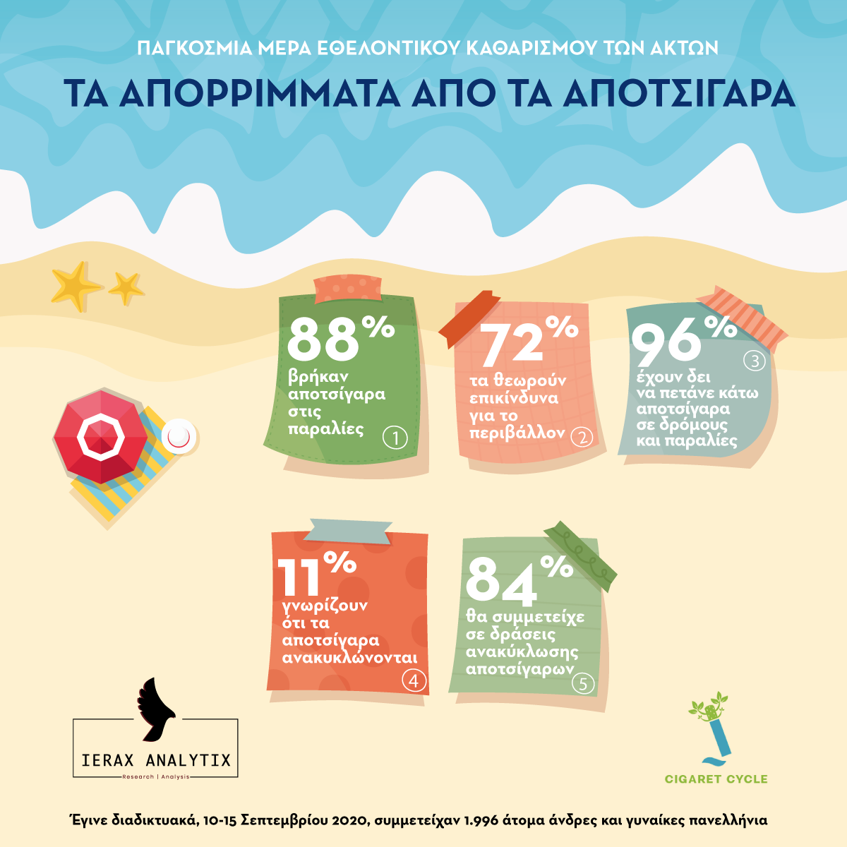 Την πολύτιμη αρωγή της ΑΜΚΕ Cigaret Cycle που εφαρμόζει το καινοτόμο πρόγραμμα ανακύκλωσης αποτσίγαρων #gopafree, είχε στο ερευνητικό της έργο η εταιρεία ερευνών IERAXANALYTIX, που διενήργησε μια έρευνα σε 1.996 άτομα,17 ετών και άνω για να μελετήσει το πρόβλημα που προκαλούν τα αποτσίγαρα ως απορρίμματα σε δρόμους και ακτές. Η έρευνα έγινε στο πλαίσιο της παγκόσμιας ημέρας εθελοντικού καθαρισμού των ακτών (19 Σεπτεμβρίου 2020). H Ελληνική Ένωση Προστασίας Θαλάσσιου Περιβάλλοντος (HELMEPA) συντονίζει κάθε χρόνο στην Ελλάδα την Παγκόσμια Ημέρα Εθελοντικού Καθαρισμού Ακτών, που πραγματοποιείται το τρίτο Σάββατο του Σεπτεμβρίου.