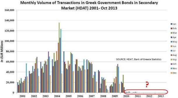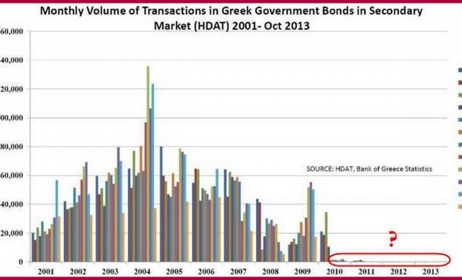 Πόσο αντιπροσωπευτική είναι η υποχώρηση των επιτοκίων στα ελληνικά ομόλογα, όταν ο όγκος συναλλαγών είναι ελάχιστος, όπως δείχνει το σχετικό διάγραμμα;