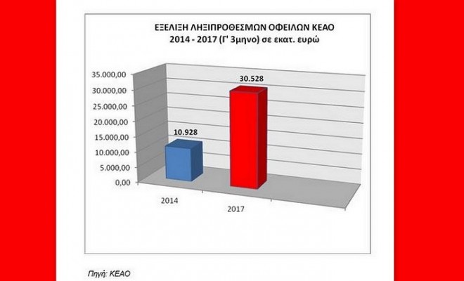 «Τα στοιχεία της τρίτης τριμηνιαίας έκθεσης προόδου εργασιών του Κέντρου Είσπραξης Ασφαλιστικών Οφειλών (ΚΕΑΟ) έτους 2017, αποτελούν ακόμη μια τραγική επιβεβαίωση των ολέθριων επιπτώσεων της διακυβέρνησης ΣΥΡΙΖΑ – ΑΝΕΛ.