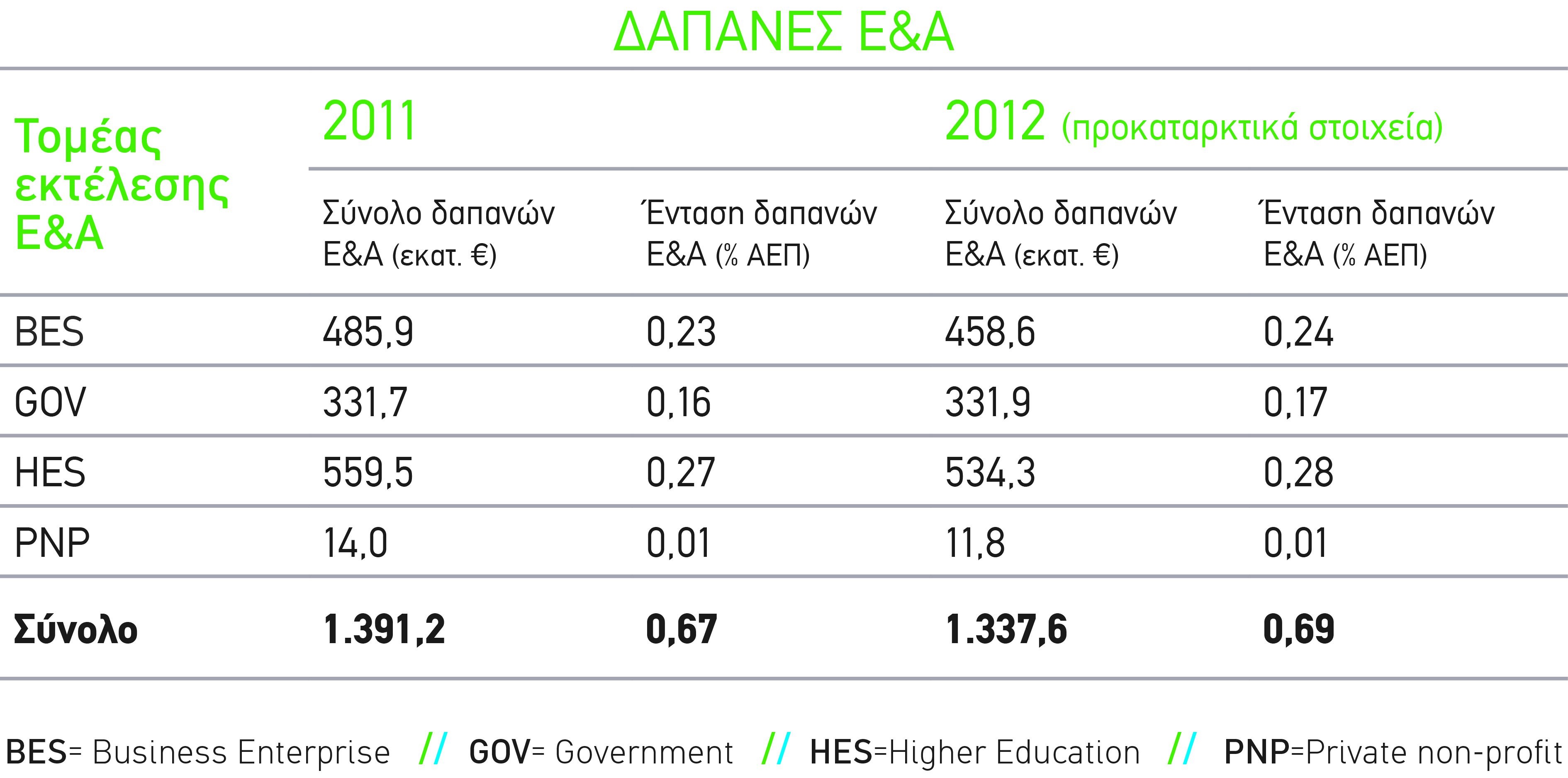 Το 2011 στην Ελλάδα δαπανήθηκαν συνολικά 1.391,2 εκατ. ευρώ σε Ε&Α, ποσό που αντιστοιχεί στο 0,67% του ΑΕΠ. Το 2012 το ποσό αυτό διαμορφώθηκε στα 1.337,6 εκατ. ευρώ (προκαταρκτικά στοιχεία), ποσό που αντιστοιχεί στο 0,69% του ΑΕΠ. Σημειώνεται ότι με βάση τα προηγούμενα διαθέσιμα στοιχεία, το 2007 οι δαπάνες για Ε&Α στην Ελλάδα ανέρχονταν στο 0,60% του ΑΕΠ.