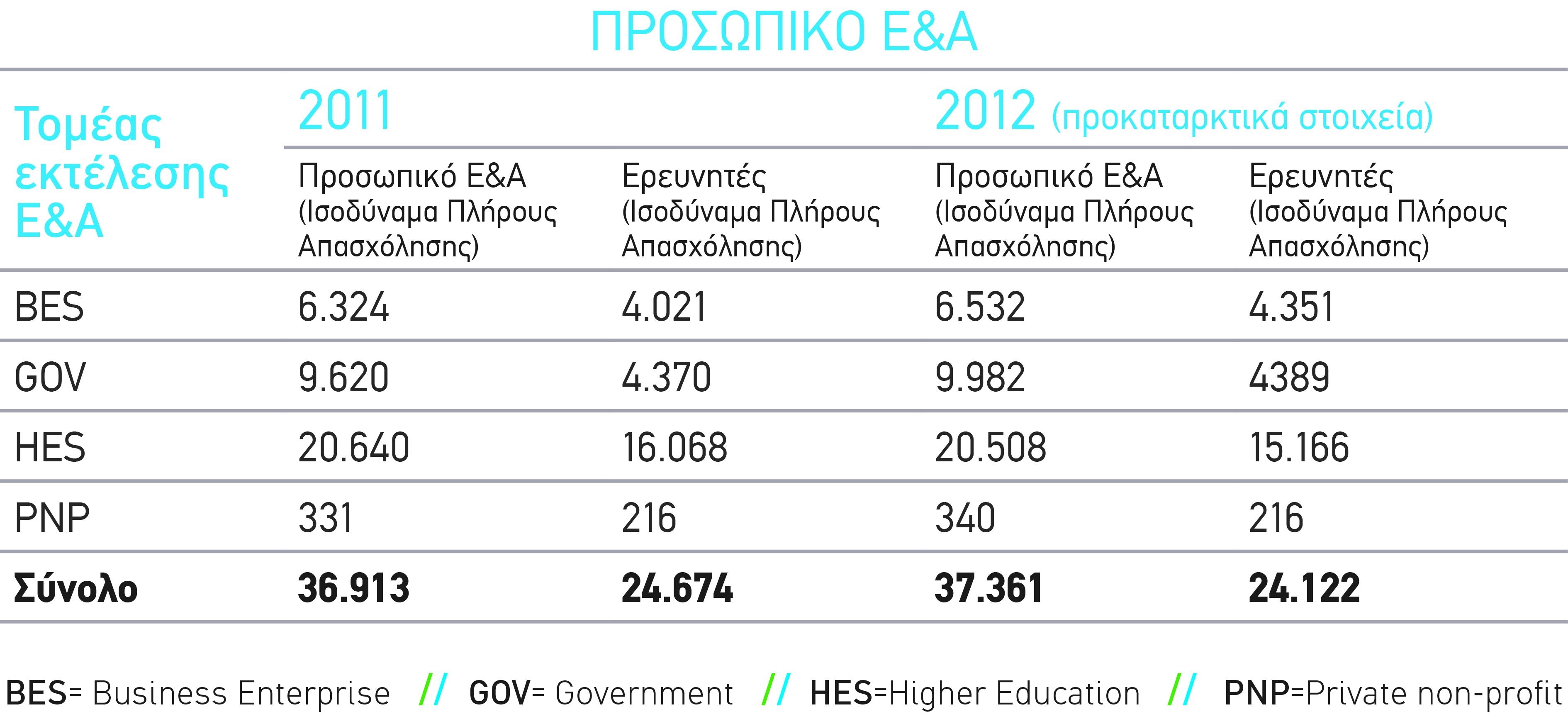 Η πλειονότητα του προσωπικού Ε&Α στην Ελλάδα απασχολείται στον τομέα της τριτοβάθμιας και μεταδευτεροβάθμιας εκπαίδευσης (συνολικά 46.348 άτομα, 20.640 ΙΠΑ. Ακολουθεί ο κρατικός τομέας με 13.260 άτομα και 9.620 ΙΠΑ, και ο τομέας των επιχειρήσεων με 9.984 άτομα και 6.324 ΙΠΑ.