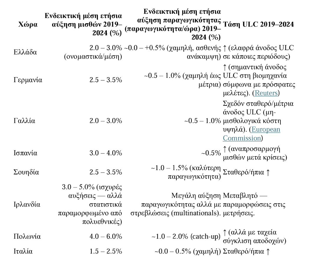 • Τα στοιχεία στο τραπέζι είναι ενδεικτικά και βασίζονται σε πρόσφατες εκθέσεις και βάσεις Eurostat / OECD / ECB (παραθέτουμε τις κύριες πηγές κάτω — χρήση των πιο πρόσφατων δημοσιεύσεων 2019–2024/2025). Πηγές: Eurostat (productivity, wages, labour costs), OECD (Real wages report), ECB (wage drift / ULC), πρόσφατα άρθρα ειδήσεων (π.χ. μελέτες για Γερμανία). (European Commission)