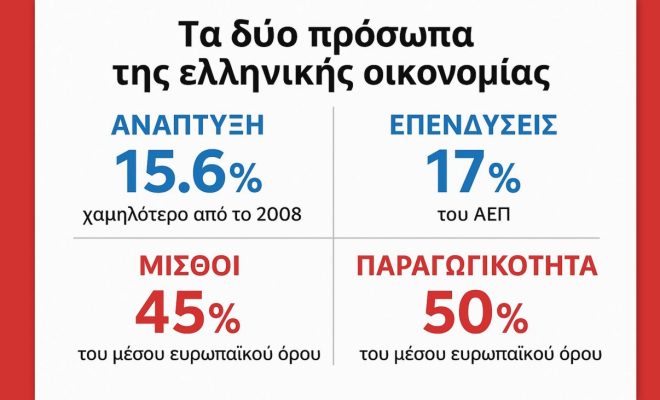 Η ελληνική οικονομία συνεχίζει να εμφανίζει μια παράδοξη διπλή εικόνα: εντυπωσιακές μακροοικονομικές επιδόσεις στο χαρτί, αλλά επίμονη στασιμότητα στην καθημερινότητα των πολιτών. Πίσω από τους αριθμούς –που η κυβέρνηση χρησιμοποιεί ως πολιτικό αφήγημα επιτυχίας– κρύβεται μια δομή οικονομίας που δεν αλλάζει με ρυθμούς που να δικαιολογούν τις θριαμβολογίες. Οι διαρθρωτικές παθογένειες παραμένουν, η παραγωγικότητα είναι καθηλωμένη, οι μισθοί παραμένουν από τους χαμηλότερους στην Ευρώπη και το επενδυτικό κενό διευρύνεται.