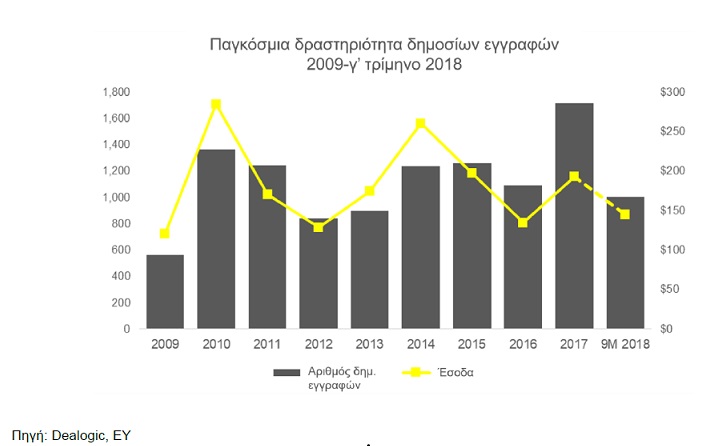 Η συνεχιζόμενη γεωπολιτική αβεβαιότητα και τα ζητήματα που έχουν προκύψει στον χώρο του εμπορίου συνεχίζουν να κάμπτουν τον ενθουσιασμό των επενδυτών, με αποτέλεσμα ο αριθμός των δημοσίων εγγραφών τους πρώτους εννέα μήνες του 2018 να υποχωρήσει σε 1.000 σε παγκόσμιο επίπεδο. Πρόκειται για μείωση κατά 18% σε σχέση με το αντίστοιχο διάστημα του 2017, κατά το οποίο είχε καταγραφεί η υψηλότερη δραστηριότητα εννεαμήνου από το 2007. Ωστόσο, παρά την επιβράδυνση αυτή, η δραστηριότητα του εννεαμήνου του 2018 παρέμεινε πάνω από τον μέσο όρο της τελευταίας δεκαετίας, με τις διεθνείς αγορές να συγκεντρώνουν 145,1 δις δολάρια, καταγράφοντας αύξηση 9% σε ετήσια βάση.