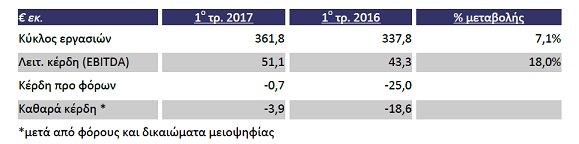Ο ενοποιημένος κύκλος εργασιών ανήλθε σε €361,8 εκ., παρουσιάζοντας αύξηση 7,1% σε σύγκριση με πέρυσι. Τα λειτουργικά κέρδη προ φόρων, τόκων και αποσβέσεων αυξήθηκαν κατά 18% στα €51,1 εκ. Τα καθαρά αποτελέσματα μετά τα δικαιώματα μειοψηφίας και την πρόβλεψη για φόρους εμφάνισαν ζημίες €3,9 εκ. κατά το –παραδοσιακά αδύναμο– χειμερινό τρίμηνο, έναντι ζημιών €18,6 εκ. το αντίστοιχο τρίμηνο του 2016.