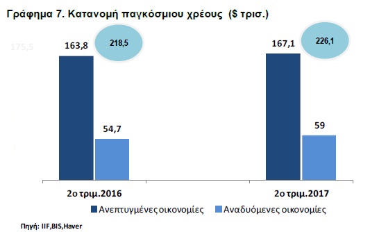 Η αύξηση του παγκόσμιου χρέους (δημοσίου & ιδιωτικού), σύμφωνα με το Διεθνές Χρηματοπιστωτικό Ινστιτούτο (The Institute of International Finance-IIF), έχει επιβραδυνθεί τα τελευταία χρόνια, ωστόσο σε απόλυτα μεγέθη το παγκόσμιο χρέος (Γράφημα 7) στο δεύτερο τρίμηνο του 2017 κατέγραψε νέο ιστορικά υψηλό, αγγίζοντας τα $226 τρισ. (324% του παγκόσμιου ΑΕΠ), με αποτέλεσμα να σημειώσει αύξηση κατά $7,6 τρισ. ή 3,5% από την αντίστοιχη περίοδο του προηγούμενου έτους.
