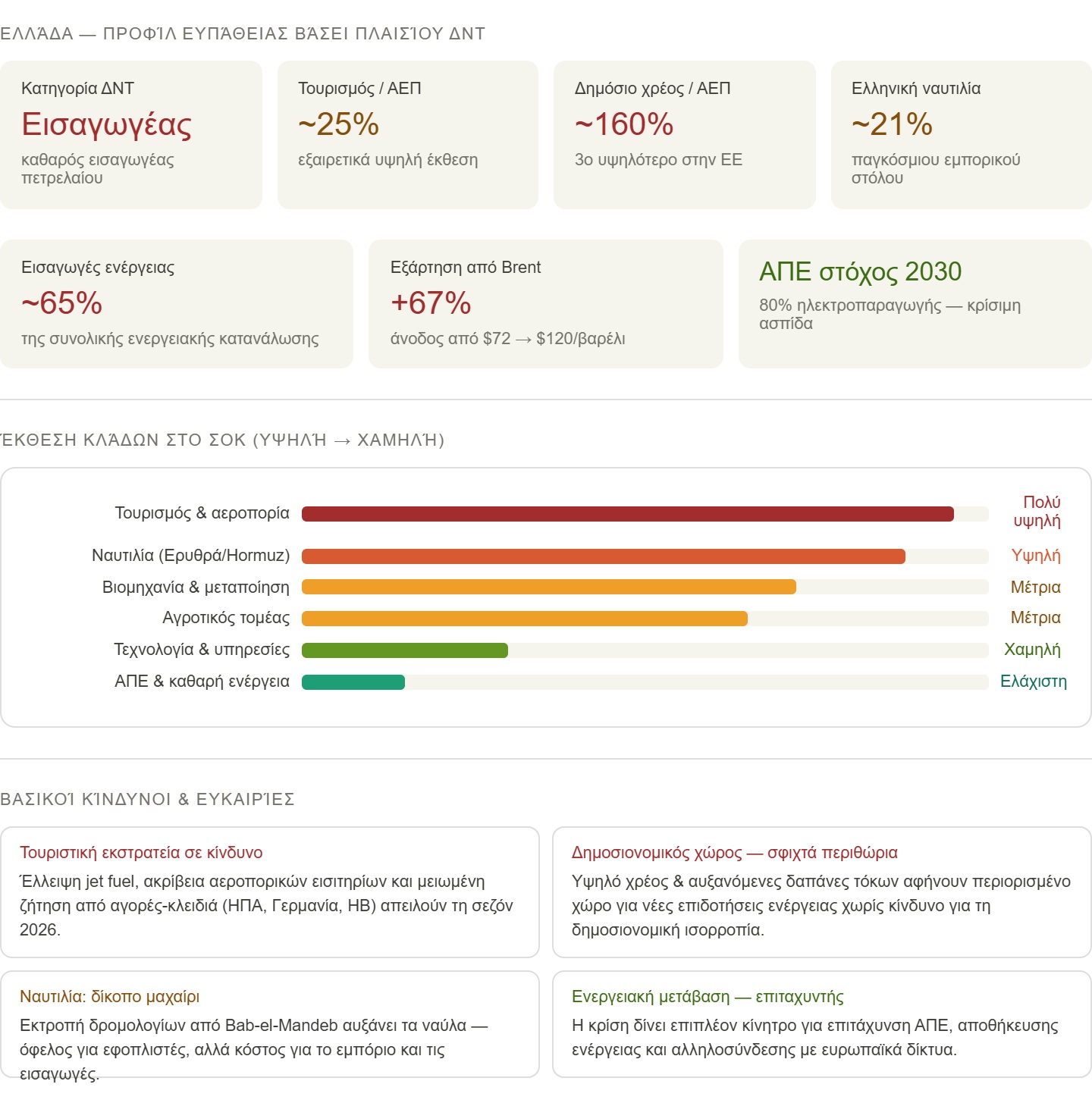 Αθήνα, Όταν η Kristalina Georgieva περιέγραψε στο ΔΝΤ τον χάρτη παγκόσμιας ευπάθειας απέναντι στο ενεργειακό σοκ — εισαγωγείς πετρελαίου με υψηλό χρέος και περιορισμένο δημοσιονομικό χώρο — η Ελλάδα δεν ονομαζόταν ρητά. Δεν χρειαζόταν. Το προφίλ της ελληνικής οικονομίας εφαρμόζει σχεδόν τέλεια στην κατηγορία των χωρών που ο οργανισμός περιγράφει ως «εκτεθειμένες σε πολλαπλά μέτωπα». Η ανάλυση που ακολουθεί αποτιμά τις επιπτώσεις στρώμα-στρώμα, από τον τουρισμό ως τη ναυτιλία, από τη δημοσιονομική πολιτική ως τις ευκαιρίες που κρύβει η ίδια η κρίση.