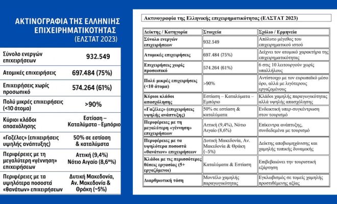 Τα πιο πρόσφατα στοιχεία της ΕΛΣΤΑΤ για τη δημογραφία των επιχειρήσεων του 2023 δεν αφήνουν περιθώρια παρερμηνειών: η Ελλάδα παραμένει μια χώρα μικρών, συχνά ατομικών, επιχειρήσεων, εγκλωβισμένη σε ένα παραγωγικό μοντέλο που στηρίζεται σε χαμηλή παραγωγικότητα, υψηλή ένταση εργασίας και, πάνω απ’ όλα, στον τουρισμό.