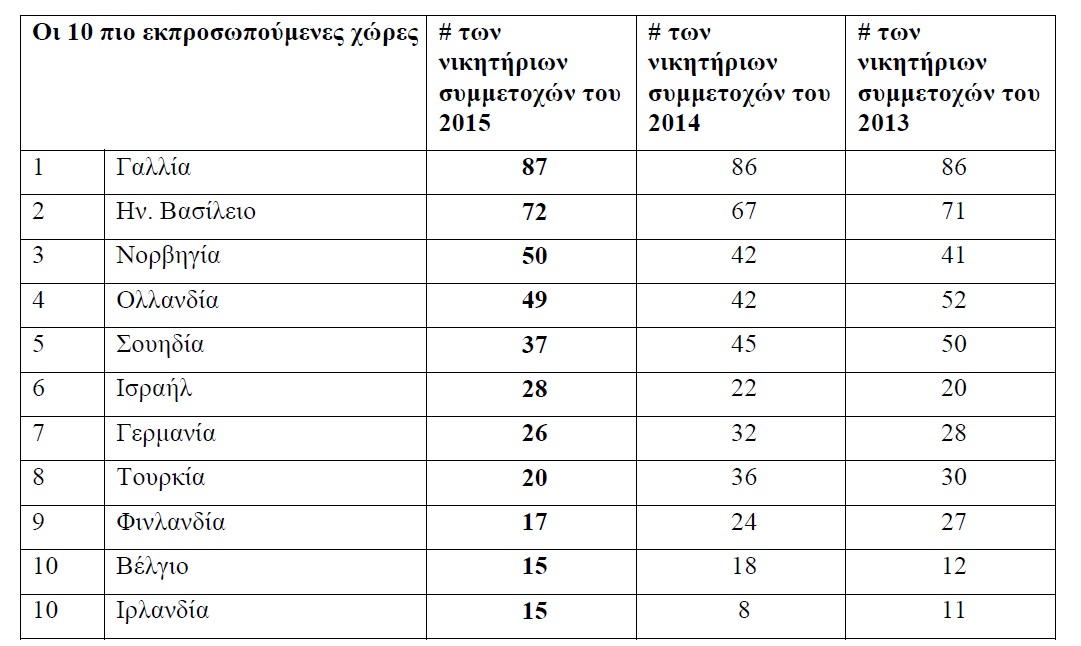 Η Γαλλία πάλι επικράτησε ως η χώρα με τις περισσότερες εταιρίες στην κατάταξη των 500 για 5η συνεχή χρονιά και οι υπόλοιπες χώρες της κορυφαίας 5άδας είναι όπως και το 2014 το Ην. Βασίλειο, η Νορβηγία, η Ολλανδία και η Σουηδία. Δυο εταιρίες από το Ισραήλ βρίσκονται ανάμεσα στις 5 κορυφαίες εταιρίες και τέσσερις εταιρίες από το Ην. Βασίλειο εντάσσονται στις 10 κορυφαίες εταιρίες της κατάταξης.