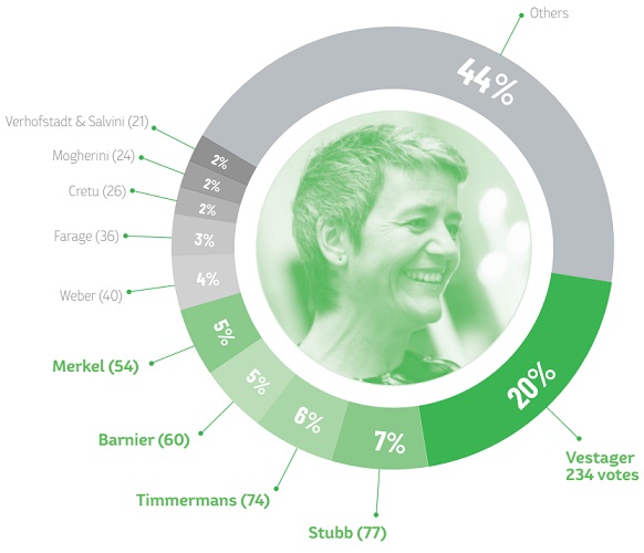 Σύμφωνα με την πανευρωπαϊκή έρευνα της εταιρείας επικοινωνίας και δημοσίων σχέσεων BCW (Burson Cohn & Wolfe) και της EURACTIV, η Μαργκρέτε Βεστάγκερ αναδείχτηκε ως η καλύτερη Επίτροπος στην Επιτροπή του Ζαν Κλοντ Γιούνκερ, ενώ σύμφωνα με την ίδια έρευνα οι ερωτηθέντες πιστεύουν πως θα πρέπει να είναι και η επόμενη Προέδρος της Εκτελεστικής Εξουσίας της ΕΕ.