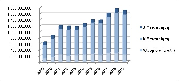 Όπως φαίνεται και στα παρακάτω γράφημα οι εξαγωγές της βιομηχανίας αλουμινίου από €600 εκ. το 2009 σχεδόν τριπλασιάστηκαν στα €1,7 δις το 2019.