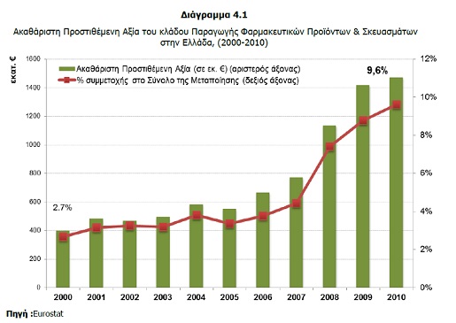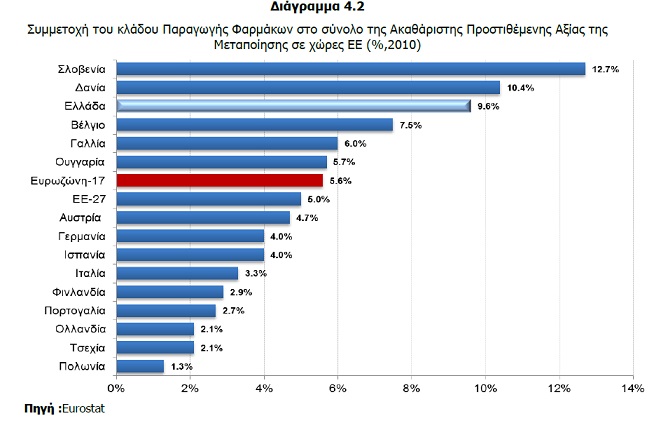 Σε όρους Ακαθάριστης Προστιθέμενης Αξίας (Διάγραμμα 4.1), ο Κλάδος Παραγωγής Φαρμάκων στην Ελλάδα συμβάλλει το 9,6% του συνόλου του Μεταποιητικού τομέα για το 2010, ένα από τα υψηλότερα ποσοστά στην Ευρώπη, μετά τη Σλοβενία (12,7%) και τη Δανία (10,4%).