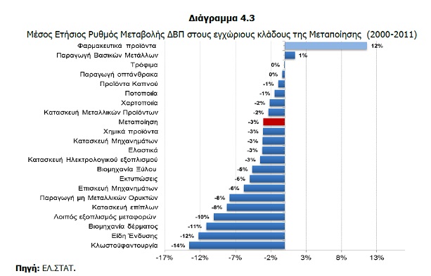 Μεταξύ των μεταποιητικών κλάδων στην Ελλάδα, η Παραγωγή Βασικών Φαρμακευτικών προϊόντων και σκευασμάτων εμφανίζει συγκριτικά ταχύτερη ανάπτυξη έναντι των υπόλοιπων κλάδων, καθώς σημείωσε την ταχύτερη διεύρυνση προϊόντος στην περίοδο 2000-2011, της τάξης του 12% ετησίως κατά μέσο όρο (Διάγραμμα 4.3).