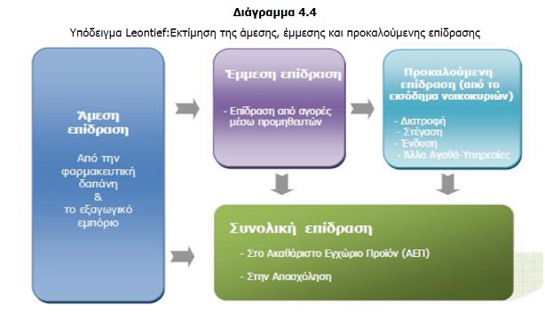Η εκτίμηση της επίδρασης (άμεσης, έμμεσης και προκαλούμενης) από την παραγωγική δραστηριότητα της εγχώριας παραγωγής φαρμάκου και την πώληση των προϊόντων της στην ελληνική οικονομία εκτιμήθηκε με τη χρήση του υποδείγματος εισροών-εκροών του Leontief για το 2010, θεωρώντας την φαρμακευτική δαπάνη ως μια εξωγενή μεταβολή στην τελική ζήτηση.