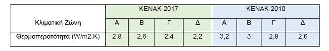 Μία ελαφρά επιβάρυνση εις το τίμημα των κουφωμάτων θα προκύψει επίσης και από τις ελαφρώς αυξημένες απαιτήσεις θερμομονωτικών ιδιοτήτων των κουφωμάτων, όπως αυτές περιγράφονται στον ακόλουθο πίνακα: