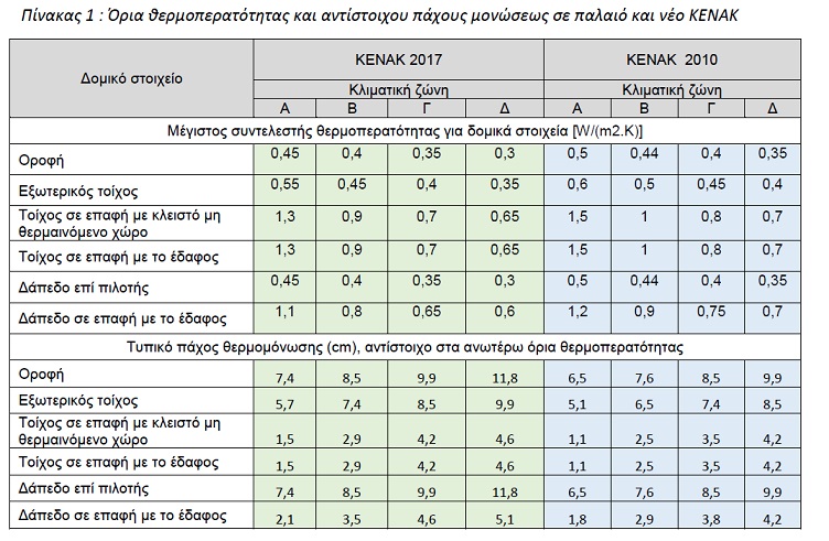 Π.χ. τα όρια για τον μέγιστο επιτρεπόμενο συντελεστή θερμομόνωσης διαφόρων δομικών στοιχείων μειώθηκαν ελαφρώς κατά περίπου 10% . Τα παλαιά και τα νέα όρια καθώς και το τυπικό πάχος θερμομόνωσης που αντιστοιχεί στα όρια αυτά δίδονται στον Πίνακα 1 που ακολουθεί.