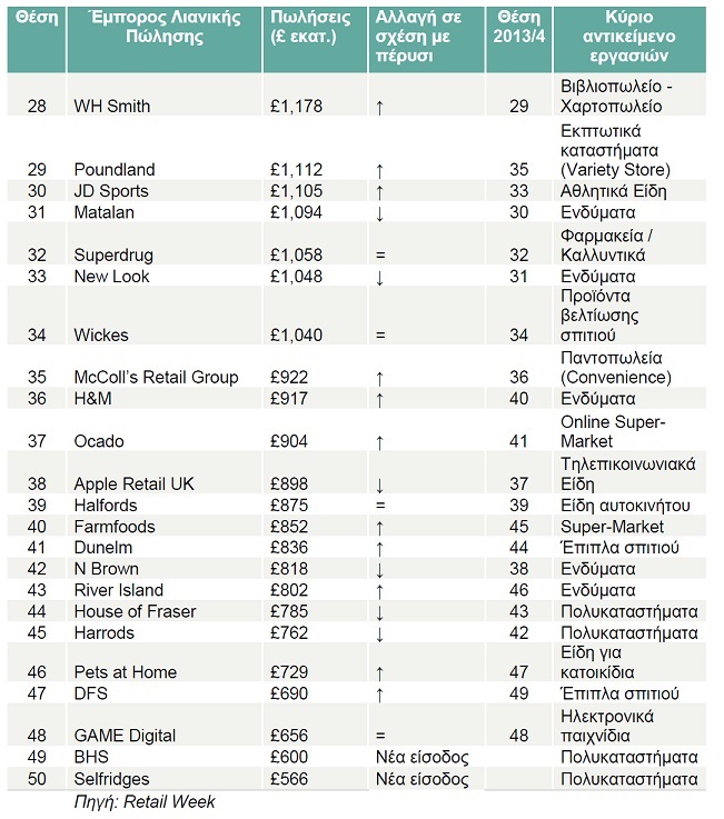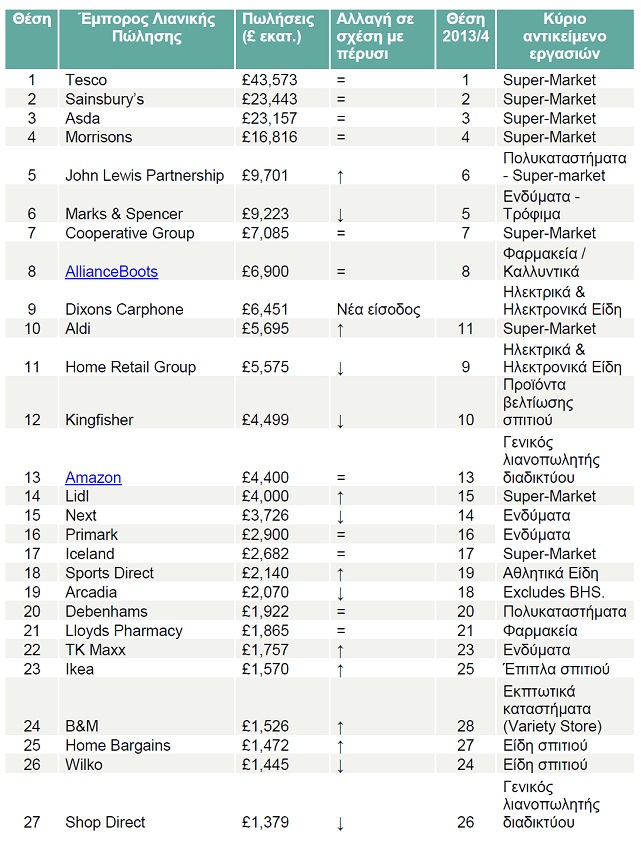Ειδικότερα, σύμφωνα με τον κατάλογο των 50 σημαντικότερων λιανοπωλητών στο Ηνωμένο Βασίλειο, οι τέσσερις μεγάλες αλυσίδες Super- Market (Tesco, Sainsbury’s, Asda, Morrisons) παραμένουν χωρίς μεταβολή στις 4 πρώτες θέσεις, ακολουθούμενες από τη John Lewis Parntership (John Lewis (πολυκαταστήματα) & Waitrose (super-market)) η οποία ξεπέρασε σε ύψος πωλήσεων τη Marks & Spencer. Τη δεκάδα συμπληρώνουν το Cooperative Group (super-market), η AllianceBoots (φαρμακεία), η Dixons Carphone (καταστήματα ηλεκτρονικών & τηλεπικοινωνιακών ειδών) και η Aldi (super-market).