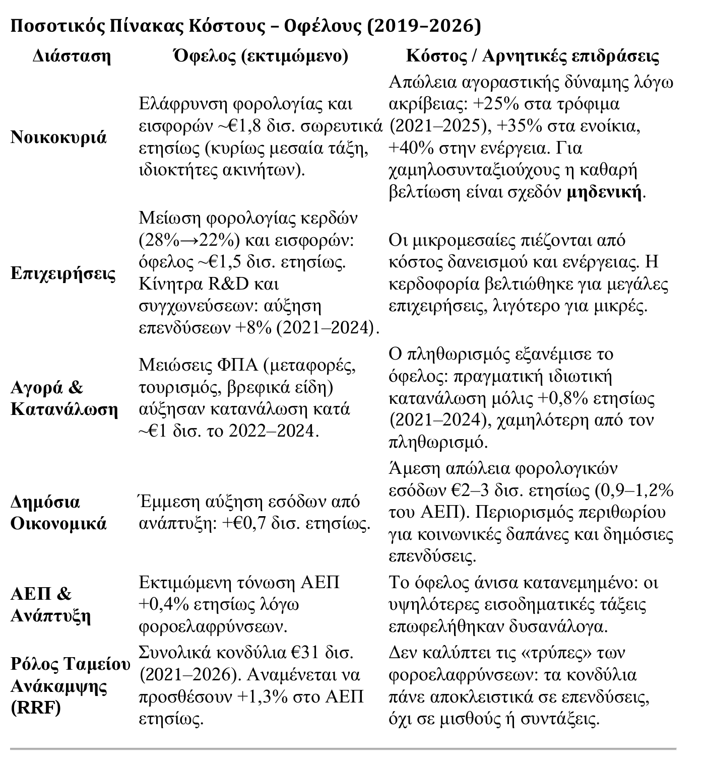 - Επίδραση στα νοικοκυριά: μεσαία τάξη +5–7% καθαρό εισόδημα, χαμηλά στρώματα σχεδόν μηδενικό όφελος.