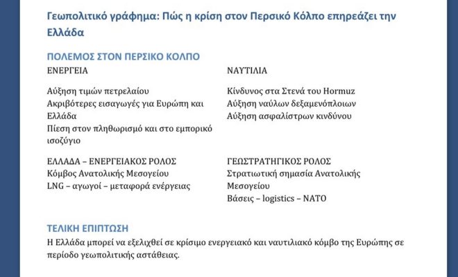 Η κρίση στον Περσικό Κόλπο δεν είναι απλώς μια ακόμη γεωπολιτική ένταση της Μέσης Ανατολής. Είναι ένα γεγονός που αλλάζει τους ενεργειακούς συσχετισμούς, μετακινεί κεφάλαια και επαναφέρει τη γεωγραφία στο κέντρο της οικονομίας. Και σε τέτοιες στιγμές, η Ελλάδα παύει να είναι μια περιφερειακή χώρα της Ευρώπης και γίνεται ξανά αυτό που ήταν ιστορικά: κόμβος διαδρομών και ισορροπιών.