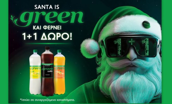 Ο Green Santa δεν φέρνει μόνο ανανεωμένο στυλ, αλλά και το «μεγάλο δώρο» των φετινών Χριστουγέννων: την εορταστική ενεργοποίηση 1+1 δώρο. Αυτή η προσφορά αφορά τα αγαπημένα αναψυκτικά Green σε συσκευασία 1,5L – συγκεκριμένα, την Green Cola, την Green Πορτοκαλάδα και την Green Λεμονάδα.