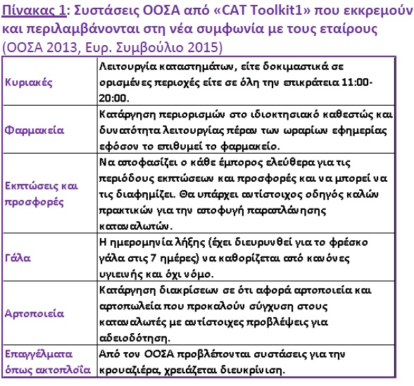 Για ορισμένες, όπως η ενοποίηση και ο εξορθολογισμός των κανόνων και πρακτικών εποπτείας της αγοράς καθώς και η εξάλειψη αλληλοεπικαλύψεων αρμοδιοτήτων φορέων, η κάλυψη κενών εποπτείας και η ενοποίηση των ποινολογίων έμειναν χωρίς εφαρμογή λόγω της αντικειμενικής δυσκολίας άμεσης υλοποίησης χωρίς αυτό να σημαίνει ότι το θέμα αυτό δεν είναι ιδιαίτερα σημαντικό για την αγορά (σημειώνεται ότι το συγκεκριμένο ζήτημα δεν περιλαμβάνεται ρητά στο κείμενο συμφωνίας της 12/7/15). Οι εταίροι τώρα επανέρχονται στις συστάσεις του ΟΟΣΑ και θέτουν ως κρίσιμα προαπαιτούμενα ειδικά τη λειτουργία των καταστημάτων τις Κυριακές, θέματα που αφορούν τις εκπτώσεις, το γάλα και τα αρτοποιεία, θέματα που αφορούν την ιδιοκτησία φαρμακείων, ΜΥΣΥΦΑ και απελευθέρωσης κλειστών επαγγελμάτων με έμφαση την ακτοπλοΐα.