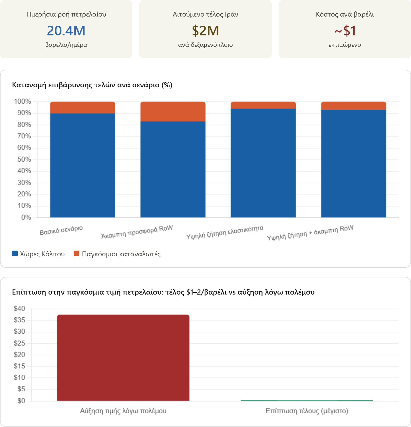 Σε όλα τα εξεταζόμενα σενάρια, οι χώρες του Κόλπου απορροφούν μεταξύ 83% και 94% του τέλους. Οι παγκόσμιοι καταναλωτές αντιμετωπίζουν αύξηση τιμής μόλις 0,05 έως 0,40 δολαρίων ανά βαρέλι — ένα κλάσμα της αύξησης 35-40 δολαρίων που έχει ήδη επιφέρει ο πόλεμος.