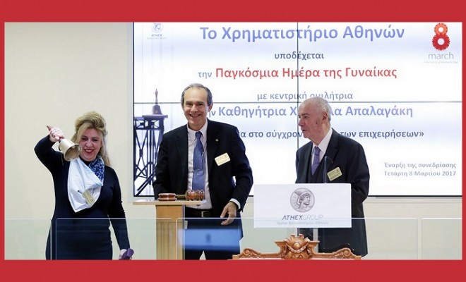 Το Χρηματιστήριο Αθηνών υποδέχθηκε σήμερα, Τετάρτη 8 Μαρτίου 2017, Παγκόσμια Ημέρα της Γυναίκας, στην τελετή Έναρξης της συνεδρίασης την Καθηγήτρια κυρία Χαρούλα Απαλαγάκη, Γενική Γραμματέα της Ένωσης Ελληνικών Τραπεζών (ΕΕΤ).