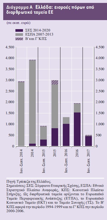 Οι ετήσιες απολήψεις της Ελλάδος από τα διαρθρωτικά ταμεία της ΕΕ ανήλθαν σε 503 εκατ. ευρώ το εννεάμηνο Ιανουαρίου-Σεπτεμβρίου του 2017, αισθητά μειωμένες σε σχέση με την αντίστοιχη περίοδο τόσο των τριών προηγούμενων ετών της τρέχουσας προγραμματικής περιόδου όσο και του τέταρτου έτους των προηγούμενων προγραμματικών περιόδων ΕΣΠΑ 2007-2013 και Γ’ ΚΠΣ 2000-2006.