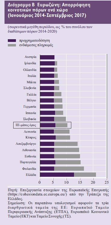 Επίσης, ο σωρευτικός ρυθμός απορρόφησης των διαρθρωτικών πόρων από την Ελλάδα είναι σημαντικά υψηλότερος από το μέσο όρο της ΕΕ (10%), γεγονός που εν μέρει αντανακλά το θετικό αποτέλεσμα της πρόσθετης προκαταβολής που δόθηκε στην Ελλάδα, η οποία ήταν σημαντικά μεγαλύτερη έναντι εκείνης άλλων κρατών-μελών της ΕΕ. Όμως, σε σύγκριση με άλλες χώρες με υψηλή απορρόφηση όπως η Φινλανδία και η Πορτογαλία, οι ενδιάμεσες πληρωμές (επιβεβαιωμένη πραγματοποιηθείσα δαπάνη) στην Ελλάδα υπολείπονται των προκαταβολών, γεγονός το οποίο μπορεί να αποτελεί ένδειξη χαμηλού ρυθμού υλοποίησης των έργων (βλ. Διάγραμμα Β).
