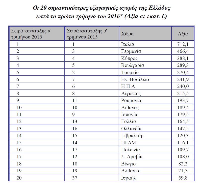 Καλύτερες επιδόσεις σε όρους κατάταξης, σε σχέση με το α’ τρίμηνο του 2015, εμφανίζουν χώρες όπως η Γαλλία, η Ολλανδία, το Γιβραλτάρ, η Πολωνία και κυρίως το Ισραήλ που βρέθηκε μεταξύ των 20 κυριότερων αγορών για τα ελληνικά προϊόντα.