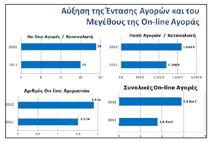 Άρα στους βασικούς δείκτες μέτρησης της on-line αγοράς είχαμε αύξηση το 2012 κατά 25-35% ενώ στις συνολικές αγορές η αύξηση ήταν πάνω από 50% σε σχέση με το 2011.