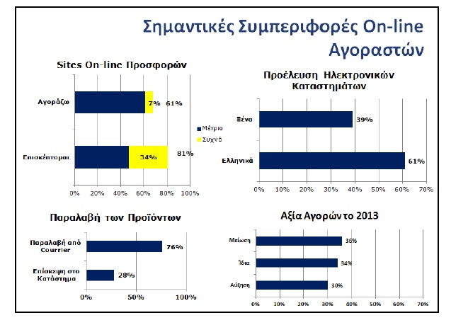 Στις σημαντικές συμπεριφορές των on-line αγοραστών καταγράφουμε ότι μόνο το 61% των αγορών πραγματοποιήθηκε σε Ελληνικά sites (σε αντίθεση με την τάση των Ευρωπαϊκών χωρών όπου το 80% των αγορών είναι από εθνικά / τοπικά sites).