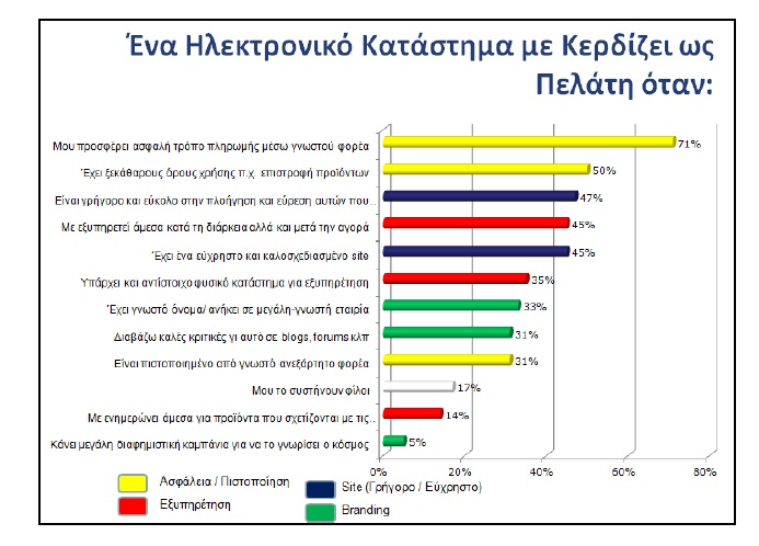 Το ενδιαφέρον είναι ότι πλέον ο Έλληνας online καταναλωτής αναφέρει όλες τις μεταβλητές επιλογών που ανήκουν στις 4 μεγάλες κατηγορίες θεμάτων που λαμβάνουμε υπ’ όψη στην ανάπτυξη ενός επιτυχημένου ηλεκτρονικού καταστήματος: ασφάλεια / πιστοποίηση, site (γρήγορο / εύχρηστο), εξυπηρέτηση, branding.