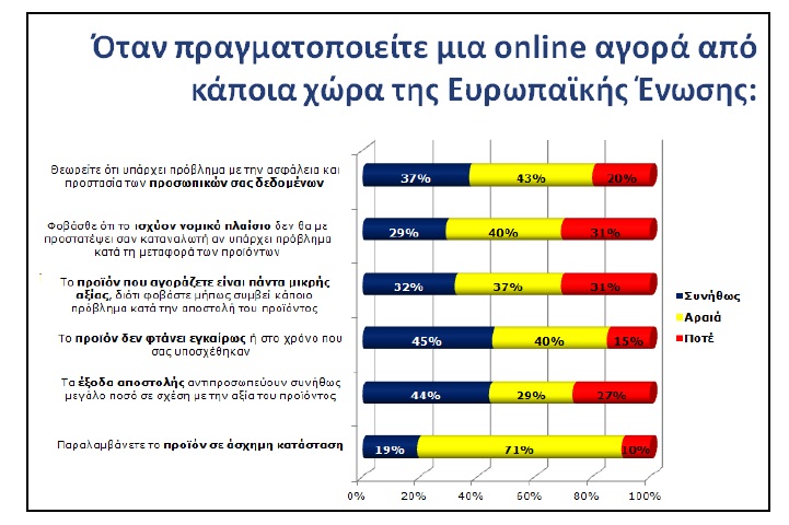 Παρ’ ότι οι Έλληνες έχουν πολύ υψηλά ποσοστά αγορών από το εξωτικό, η έρευνα καταδεικνύει ότι υπάρχουν προβλήματα σε αυτές τις on-line συναλλαγές αφού 1/3 περίπου αντιλαμβάνεται προβλήματα με ασφάλεια / θεσμικό πλαίσιο, ½ αναφέρεται στην προβληματική κατάσταση των logistics (πχ. έγκαιρη παράδοση, έξοδα αποστολής) ενώ 1/5 παραλαμβάνει συνήθως το προϊόν σε άσχημα κατάσταση.