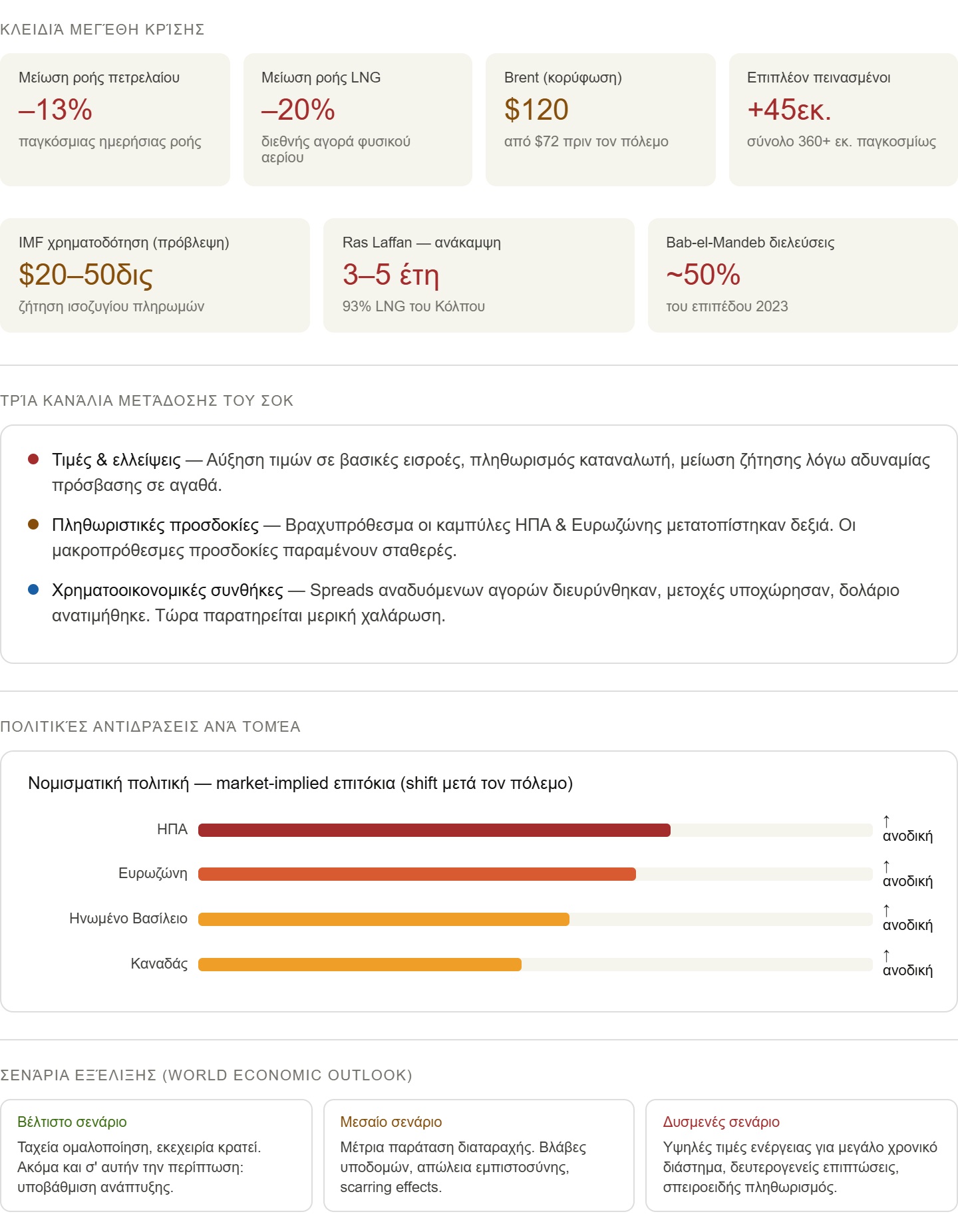 Η ανάλυση των διαδρομών μετάδοσης του σοκ αποκαλύπτει την οικονομική λογική πίσω από την ανησυχία του ΔΝΤ. Το πρώτο κανάλι — τιμές και ελλείψεις — είναι το πλέον ορατό: η άνοδος του Brent από τα 72 στα 120 δολάρια το βαρέλι, με μεταφορά κόστους σε βιομηχανικά αγαθά, τρόφιμα και μεταφορές. Το δεύτερο κανάλι είναι πιο λεπτό και δυνητικά πιο επικίνδυνο: οι πληθωριστικές προσδοκίες. Η Georgieva επεσήμανε με ανακούφιση ότι οι μακροπρόθεσμες προσδοκίες δεν έχουν αποσταθεροποιηθεί — αλλά ακριβώς αυτή η «κόκκινη γραμμή» παραμένει υπό αδιάλειπτη επιτήρηση.