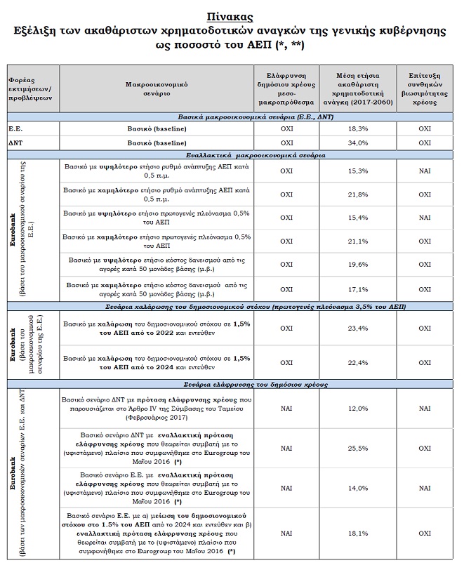 (*) Το εναλλακτικό (υποθετικό) σενάριο μεσο-μακροπρόθεσμης ελάφρυνσης δημόσιου χρέους που αναλύεται στο κάτω μέρος του ανωτέρου πίνακα θεωρείται ότι είναι συμβατό με το σχετικό πλαίσιο που συμφωνήθηκε στο Eurogroup του Μαΐου 2016 και περιλαμβάνει τις ακόλουθες παρεμβάσεις: (i) σταδιακή επιστροφή στην Ελλάδα της όποιας υπεραπόδοσης συσσωρευτεί μετά το 2018 στα χαρτοφυλάκια ελληνικών κυβερνητικών ομολόγων (ANFA και AMP) που βρίσκονται στην κατοχή του Ευρωσυστήματος (καθώς και σχετικού ποσού €1,8δις που εκκρεμεί από το 2014), (ii) κατάργηση του επιτοκιακού περιθωρίου που συνδέεται με τη δόση του δανείου για την αποπεράτωση του προγράμματος επαναγοράς ελληνικού δημόσιου χρέους (debt buyback) το Δεκέμβριο του 2012, και (iii) τη μετακύλιση των πληρωμών για χρεολύσια του συνόλου των δανείων του EFSF που έλαβε η Ελλάδα στο πλαίσιο του 2ου προγράμματος προσαρμογής.