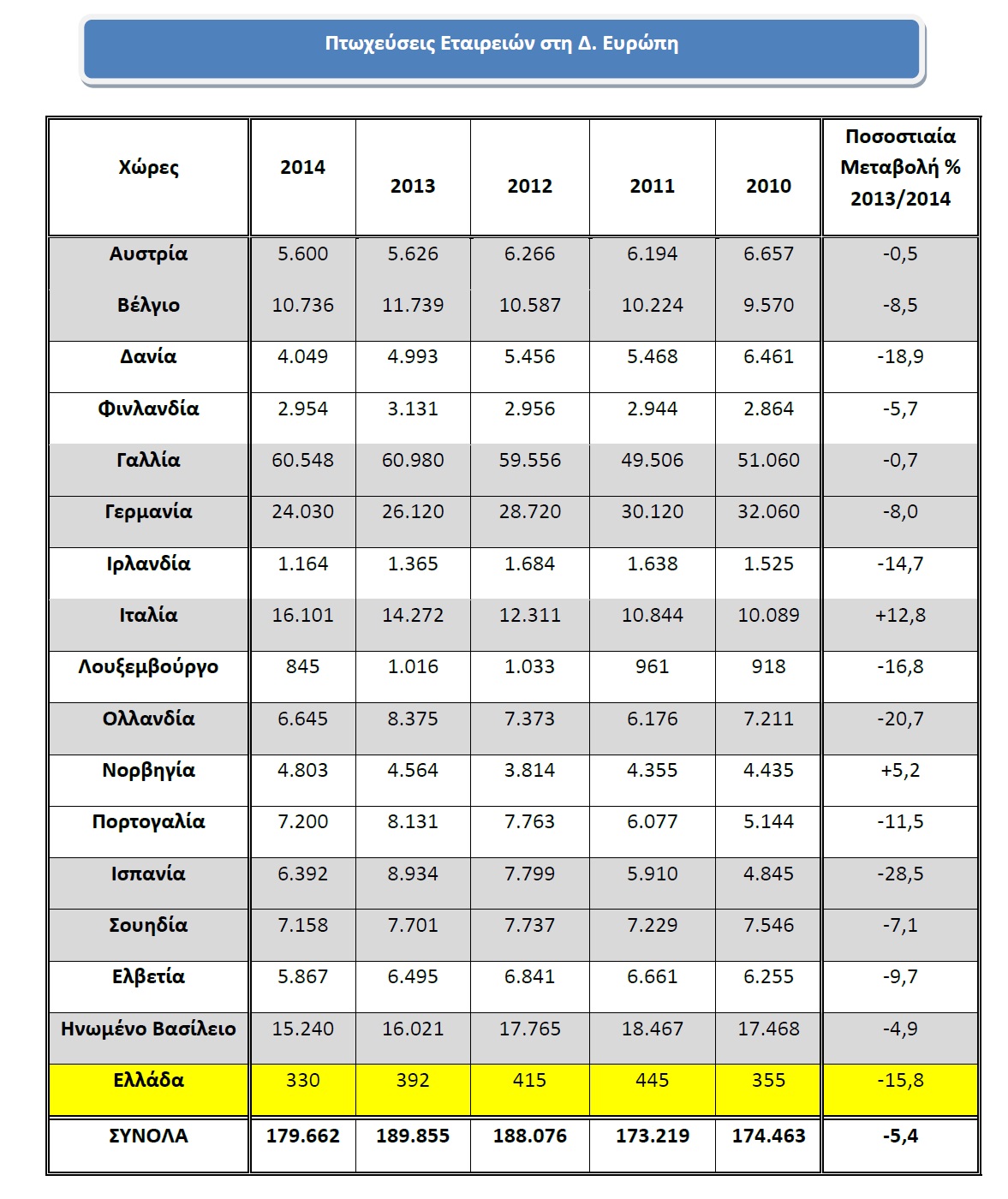 Στην Ελλάδα σημειώθηκαν 330 πτωχεύσεις το 2014, έναντι 392 πτωχεύσεων το 2013, μείωση της τάξης του 15,8%, η δεύτερη μεγαλύτερη ποσοστιαία μείωση στον Ευρωπαϊκό νότο μετά από την Ισπανία. Στο σημείο αυτό θα πρέπει να σημειωθεί ότι η  Ελλάδα, είναι μία από τις χώρες που μόνο ένα μικρό ποσοστό των εταιρικών λουκέτων, πραγματοποιήθηκε μέσω των επίσημων διαδικασιών του πτωχευτικού κώδικα.
