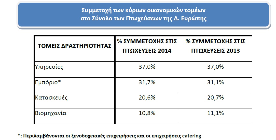 Συγκριτικά με το 2013 η εικόνα της συμμετοχής των Τομέων Δραστηριότητας στο σύνολο των Πτωχεύσεων παραμένει ίδια με τον Τομέα των Υπηρεσιών να έχει τη μεγαλύτερη συμμετοχή (37%) στο σύνολο των πτωχεύσεων της Δ. Ευρώπης το 2014, παραμένοντας σταθερός έναντι της περσινής χρονιάς. Ο Τομέας του Εμπορίου, στον οποίο συμπεριλαμβάνεται το Λιανικό και Χονδρικό Εμπόριο, οι ξενοδοχειακές επιχειρήσεις και οι επιχειρήσεις catering, αύξησαν ελαφρώς τη συμμετοχή τους, από 31,1% σε 31,7%, με 1 στις 3 επιχειρήσεις να δηλώνουν πτώχευση το 2014.