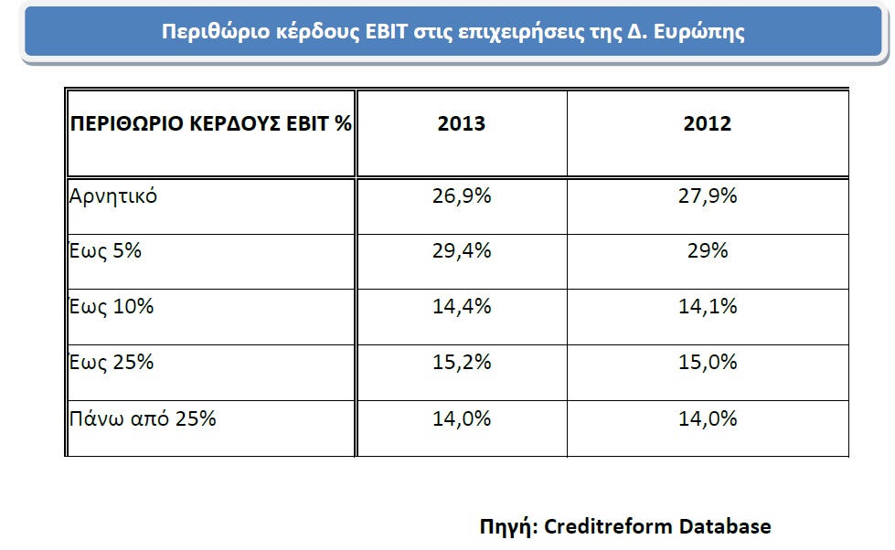 Εξετάζοντας τους πιο πρόσφατους δημοσιευμένους ισολογισμούς του 2013 σε δείγμα 3,3 εκατ. επιχειρήσεων της Δυτικής Ευρώπης διαπιστώνεται ότι η συμμετοχή των εταιρειών που εμφανίζουν χαμηλό περιθώριο ΕΒΙΤ (έως 5%) αυξήθηκε από 29% το 2012 σε 29,4% το 2013, ενώ η συμμετοχή εκείνων με αρνητικό περιθώριο μειώθηκε από 27,9% σε 26,9% το 2013. Περίπου μία στις επτά εταιρείες (15,2%) εμφανίζουν περιθώριο κέρδους ΕΒΙΤ έως 25% το 2013, ενώ οι επιχειρήσεις που δηλώνουν περιθώριο κέρδους ΕΒΙΤ πάνω από 25% (14%) παραμένουν σταθερές συγκριτικά με το προηγούμενο έτος.