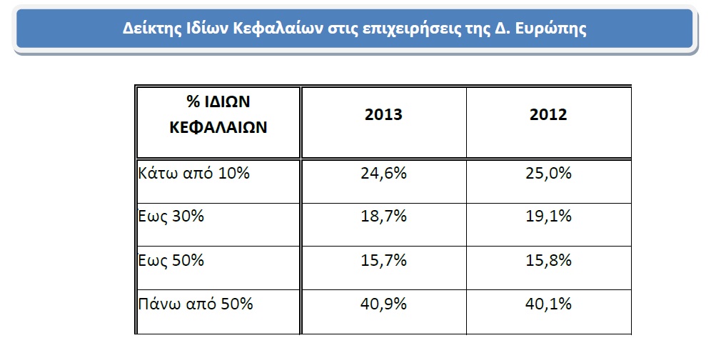 Περίπου μία στις τέσσερις επιχειρήσεις στην Ευρώπη παρουσιάζει έλλειψη κεφαλαίων, όπως και το 2012. Ο αριθμός των επιχειρήσεων με υψηλά επίπεδα (+50%) Ιδίων Κεφαλαίων αυξήθηκε ελάχιστα, ενώ και το μέγεθος των Ιδίων Κεφαλαίων τους βελτιώθηκε περεταίρω με αποτέλεσμα μια στις δυο επιχειρήσεις να είναι σε θέση να αυξήσει το Δείκτη Ιδίων Κεφαλαίων.
