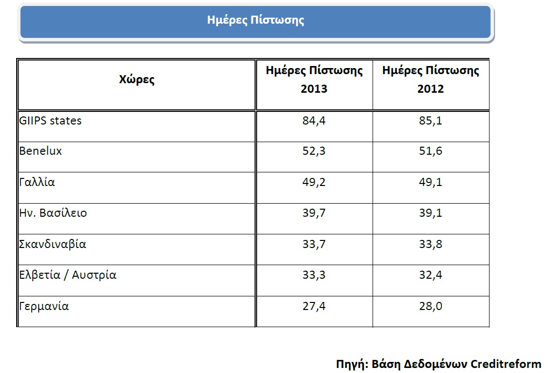 Σημαντική διαφοροποίηση παρουσιάζουν οι ημέρες είσπραξης των απαιτήσεων μεταξύ των χωρών & περιοχών της Ευρώπης. Για τις επιχειρήσεις της Δυτικής Ευρώπης, ο μέσος όρος είσπραξης το 2013 ήταν 56,3 ημέρες, οριακά λιγότερο από το προηγούμενο έτος (56,5 ημέρες). Η περίοδος συλλογής είναι μεγαλύτερη στις χώρες GIIPS (Ελλάδα,  Ιρλανδία,  Ιταλία, Πορτογαλία και Ισπανία), όπου ο μέσος όρος ήταν 84,4 ημέρες, το  οποίο αποτελεί στην πραγματικότητα μια ελαφρά βελτίωση σε σχέση με το 2012.